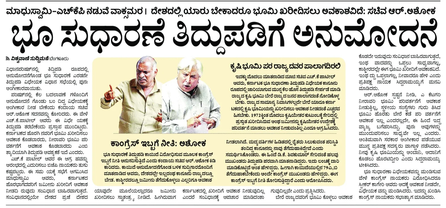 🗞️ ಭೂಸುಧಾರಣೆ ತಿದ್ದುಪಡಿಗೆ ಅನುಮೋದನೆ.